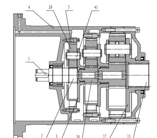 在工作時, 電機通過聯(lián)軸與減速機輸入裝置 1 相連,驅(qū)動第一級太陽輪 7,太陽輪驅(qū)動第一級行星輪 20,帶動第一級行星架 3 繞太陽輪軸線轉(zhuǎn)動,從而驅(qū)動第二級太陽輪 18,并依次驅(qū)動第二、第三級行星輪系傳動機構(gòu),最后由輸出裝置 15 輸出轉(zhuǎn)矩。各級行星輪系傳動機構(gòu)中的行星輪也可以是四個以上。