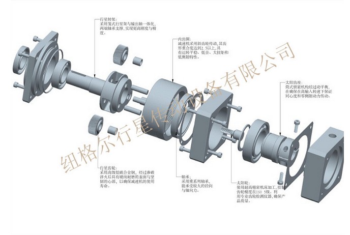 伺服行星減速機(jī)傳動(dòng)結(jié)構(gòu)可分為四個(gè)部分: 1、太陽齒輪 2、行星齒輪 3、內(nèi)齒輪環(huán) 4、階段齒輪 。伺服行星減速機(jī)驅(qū)動(dòng)源直接連接啟動(dòng)太陽齒輪,然后太陽齒輪將組合于行星齒輪架上的行星齒輪帶動(dòng)運(yùn)轉(zhuǎn)。整組行星齒輪系統(tǒng)沿著外齒輪環(huán)自動(dòng)運(yùn)行轉(zhuǎn)動(dòng),行星架連接轉(zhuǎn)動(dòng)軸輸出達(dá)到加速運(yùn)轉(zhuǎn)目的。如果需要更高減速比則需要由多組階段齒輪與行星齒輪共同運(yùn)轉(zhuǎn)。